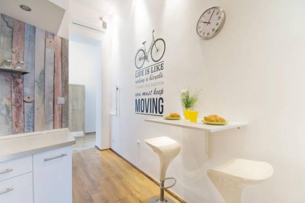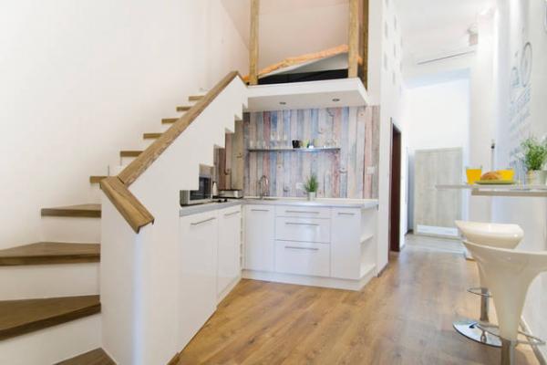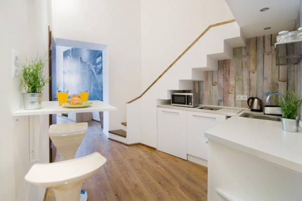 A tér kihasználás és növelés koncepcióját együttesen segítette, hogy a konyhaszekrény és a főzőfelületek egy felfelé ívelő lépcsősor alá kerültek. A lépcső, ami az égbe emelkedik mindig is nyitottá és nagyobbá teszi a teret. A lépcsőkialakításánál is a természetes fahatások domináltak. A lépcső felfelé ívelését adják vissza azok az egyedi székek, amiket a kisétkező asztalhoz A konyha kialakításából is jól látható, hogy ez egy szerelmes párnak tökéletes otthona lesz. Ebbe a természetes és világos térbe, bármilyen étel is kerüljön az asztalra, annak a színei – mint itt a narancslé – megsokszorozzák a konyha hangulatát. A falon egy kerékpárt ábrázoló kép is pontosan ennek a természetességnek, fiatalos lendületnek a szimbóluma ebben a konyhában.